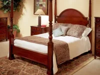 Traditional bedroom suite with arched poster bed matching dresser and nightstands in warm cherry featuring ornate turned posts and classic flamingo artwork