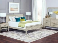 SA14 - Shaker style bedroom set featuring solid oak panel bed dresser and nightstands with simple round pulls accented by landscape artwork and gray bedding