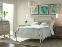 SA46 - Coastal farmhouse bedroom collection in weathered gray featuring panel bed dresser and nightstands with navy accents blue glass vases and seascape artwork