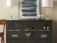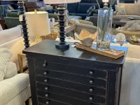 DC29SR - Distressed black apothecary chest with symmetrical rows of round knobs paired with spiral-based lamps surrounded by living room furniture on a showroom floor