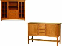 DR10VF - Honey-toned solid wood buffet with glass doors on left against white background - matching hutch with paneled cabinets and drawers on right