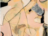 Rowe - Beige Patterned Armchair With Plush Cushions Near Floor Lamp, White Vase, Books, Under Abstract Art, Home Decor