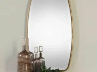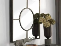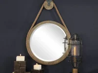 Rowe - Wooden Console Table With Books And Decor Under Large Round Mirror Near Striped Wallpaper