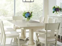 Rowe - Wooden Dining Table With Beige Slipcovered Chairs, White Vase Centerpiece, Under Framed Art, Home Decor