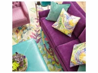 LR53NW - Loveseat with white black and peacock color throw pillows facing matching sofa also peacock chairs