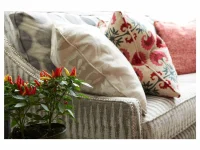 Rowe - close-up view of a tan upholstered sofa with plush cushions and a draped throw, placed on a light rug near a white cabinet with a lamp, books, and a potted olive tree by a large window