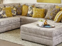 LR66NW - Upholstered modular sectional sofa in a deep navy blue fabric with patterned throw pillows and matching ottoman