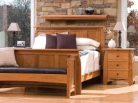 SA14 - Shaker style bedroom set featuring solid oak panel bed dresser and nightstands with simple round pulls accented by landscape artwork and gray bedding