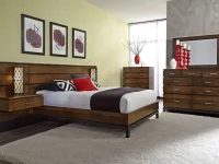 SA45 - Contemporary Shaker bedroom set in brown cherry featuring panel bed tall dresser and curved nightstands with chrome hardware and geometric black white artwork