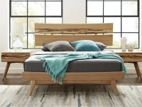 BR16SA - Mid-century modern solid wood light bed frame with extended headboard and integrated floating nightstand plus double and single width dressers