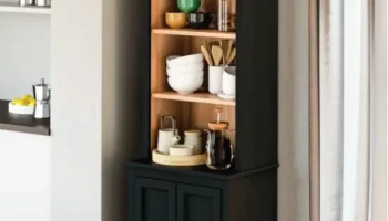 DR9WW - Tall black-painted hardwood corner hutch with visible grain housing assorted kitchenware on open shelves above enclosed cabinet doors
