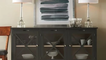 DR12GC - Charcoal-finished credenza with X-pattern glass doors displaying tableware accented with gold knobs