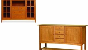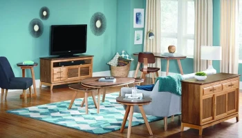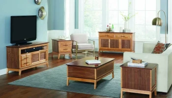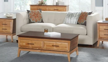 LR17WW - Solid wood living room furniture featuring mid-century modern TV console lift-top coffee table minimalist end table sideboard with contrasting wood panels