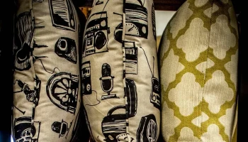 Rowe - Cream Upholstered Armchair With Patterned Pillow Near Window, On Wooden Floor, Home Decor