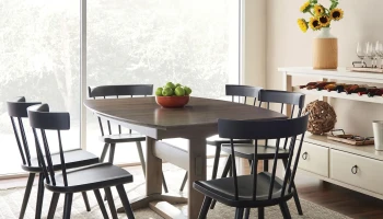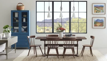 DR5GC - Coordinated warm wooden dining table set with spindle-backed chairs in front of wooden buffet