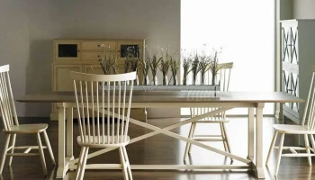 DR13GC - farmhouse-style dining set with natural wood table contrasting cream spindle-back chairs sideboard with glass doors X-shaped wooden overlays and traditional buffet cabinet