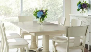 DR14GC - Polished wood dining set with simple lines and soft grey seat cushions complemented by hydrangea bouquet