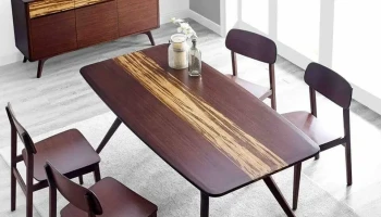 DR16GN - Espresso-finished bamboo dining table with striking central inlay of lighter wood accompanied by four sleek bamboo dining chairs and dark bamboo sideboard with lighter wood accents
