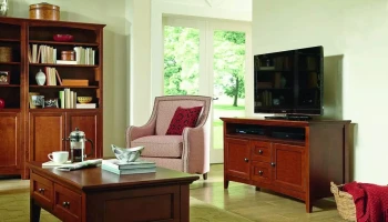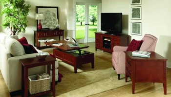 LR15WW - Room scene featuring cherry wood furniture - coffee table with inner storage and liftable top - entertainment stand - end table - traditional sideboard with storage drawers