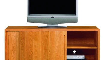LR18VF - Cherry sliding 2-door media console shown with door partially open with adjustable shelves