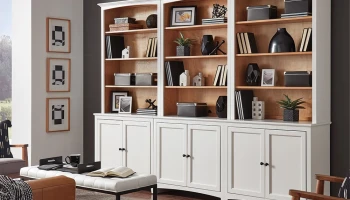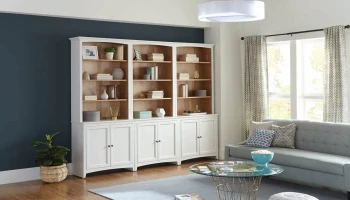 LR23WW - Sizable clean and classic elegantly crafted solid wood bookcase with open shelving and white base with six cabinet doors