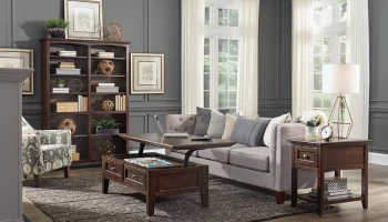 LR22WW - Dark-toned solid wood living room furniture including elegant bookshelf lift-top coffee table and sturdy classic sidetable