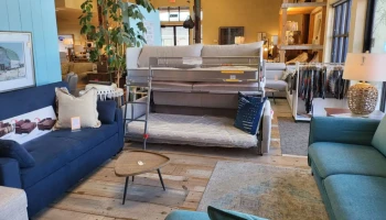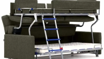 LR38SR - Bunk bed sleeper sofa next to stylish blue sofa living room coffee table and light blue sectional with throw pillows and artisan lamp and chic rug