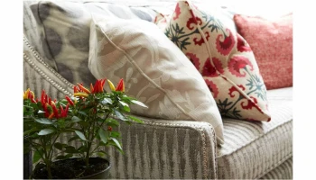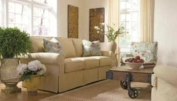 Rowe - Light Beige Sofa With Plush Cushions Near Potted Plant On Sisal Rug Upholstery Home Decor