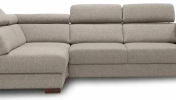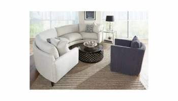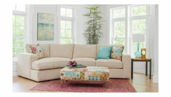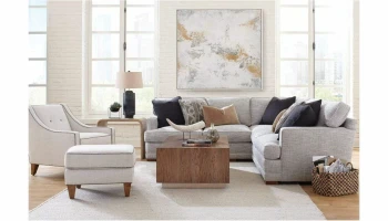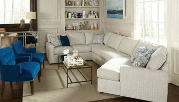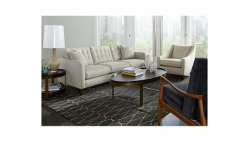 Rowe - Beige Sectional Sofa With Plush Cushions Near Large Windows And Plant, With Wooden Coffee Table, Home Decor
