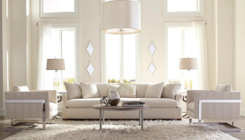 Rowe - White Sofa With Plush Cushions Under Large Window Near Wooden Console Table, Beige Ottoman, Home Decor
