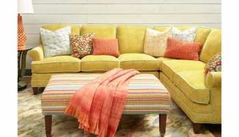 Rowe - Green Velvet Sofa With Yellow And Beige Pillows Under Large Window Near Side Table Home Decor
