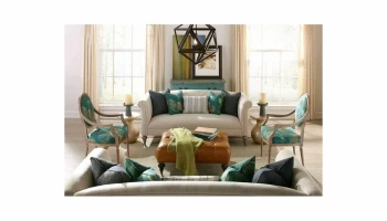 LR53NW - Loveseat with white black and peacock color throw pillows facing matching sofa also peacock chairs
