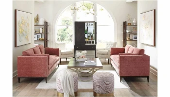 Rowe - Green Velvet Sofa With White Side Tables Under Framed Artwork Near Patterned Ottoman Home Decor