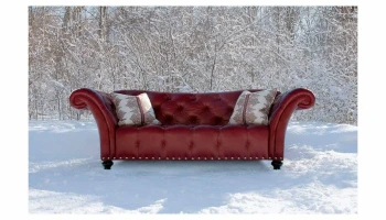 LR63RW - Comfortable living room setting with grey tufted fabric sofa, red padded white painted chair, and clear living room table