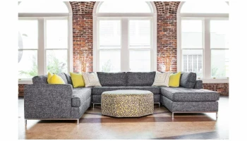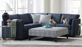 LR66NW - Upholstered modular sectional sofa in a deep navy blue fabric with patterned throw pillows and matching ottoman