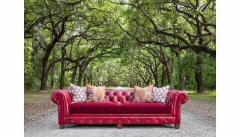 Rowe - Green Velvet Sofa With Plush Cushions Under Framed Artwork Near Patterned Lamp And Console Table