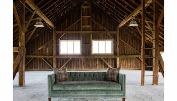 Rowe - White Armchair And Green Sofa With Ottoman Under Wooden Beams Near Large Windows Home Decor