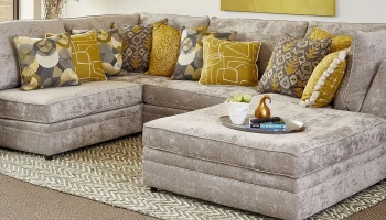 Rowe - Golden Velvet Sofa With Plush Cushions Near Large Window And Black Coffee Table Home Decor